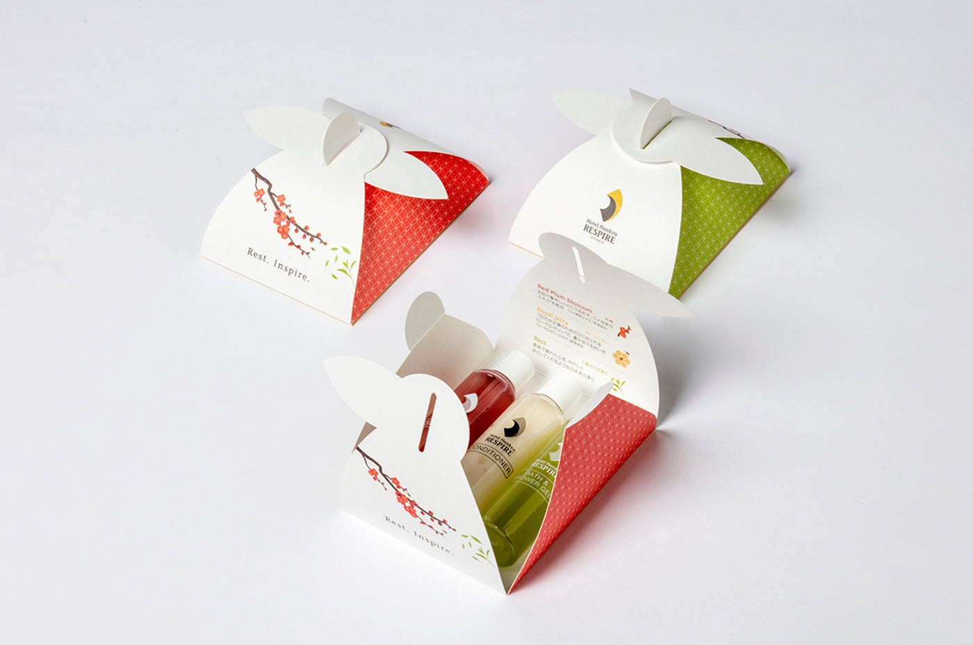 ホテル阪急レスパイア大阪様のプレ・オープニングイベントで、来場者様にお配りするシャンプー・コンディショナー等のアメニティセットのパッケージデザインを担当いたしました。ホテルコンセプトやその世界観が伝わるイラストや配色で、縁起の良い「七宝」の和柄をあしらい、手に取った際に嬉しい気持ちになれるデザインに仕上げました。